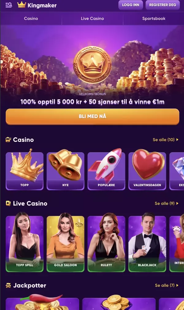 Hos Kingmaker Casino Norge kan du bytte mellom spilleautomater, live dealer-bord, klassiske bordspill, jackpoter, instantspill og våre sportstilbud under én konto. Du beholder full kontroll over innskudd, uttak og kampanjer fra samme meny. Når du trenger å sjekke saldo eller grenser, tar det bare noen få trykk.